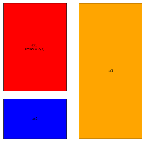 ax1.text(0.5, 0.5, "ax1 \n(rows = 2/3)", horizontalalignment='center', verticalalignment='center') ax2.text(0.5, 0.5, "ax2", horizontalalignment='center', verticalalignment='center') ax3.text(0.5, 0.5, "ax3", horizontalalignment='center', verticalalignment='center')