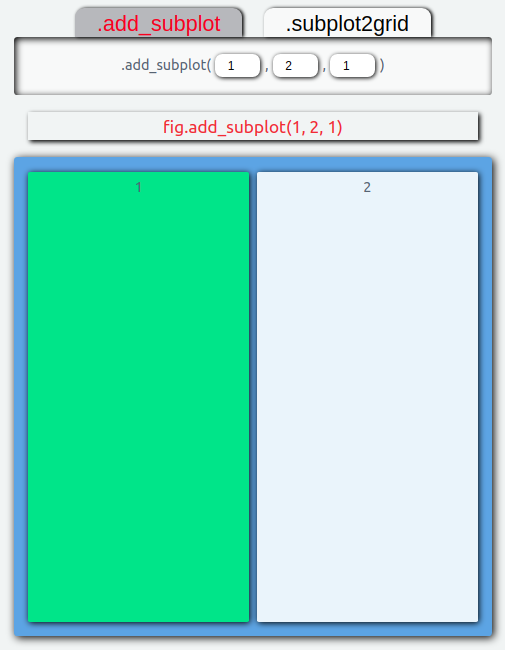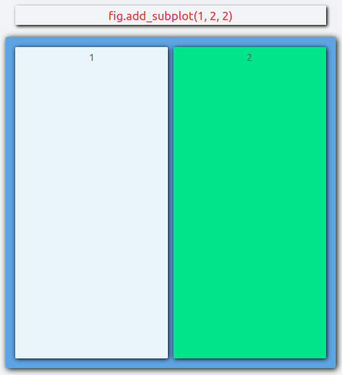 I find this visualization much clearer than any of the explanations I saw. We can see 1 row and 2 columns. Then, highlighted in green, we can see that the cell indexed with number 1 is our selected subplot. Great! Our first subplot is done.