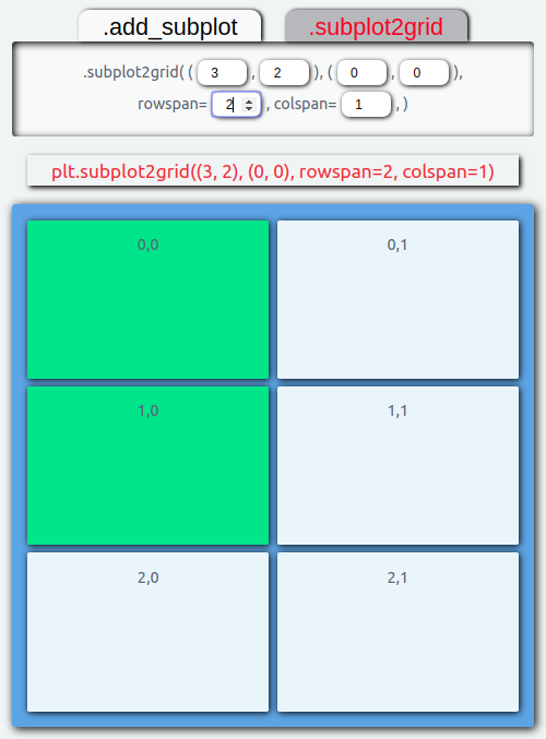 Our grid shape is the same (3,2). And since we’re just selecting one cell, we’ll leave both the rowspan and colspan set to 1. We just need to point out loc argument to the correct cell. Conveniently, the cells in the plot planner app are labeled with the location of that cell in the grid (though they are not difficult to figure out). From the image above, we want cell (2,0), so we’ll just plug that into our loc argument. The code would then be: